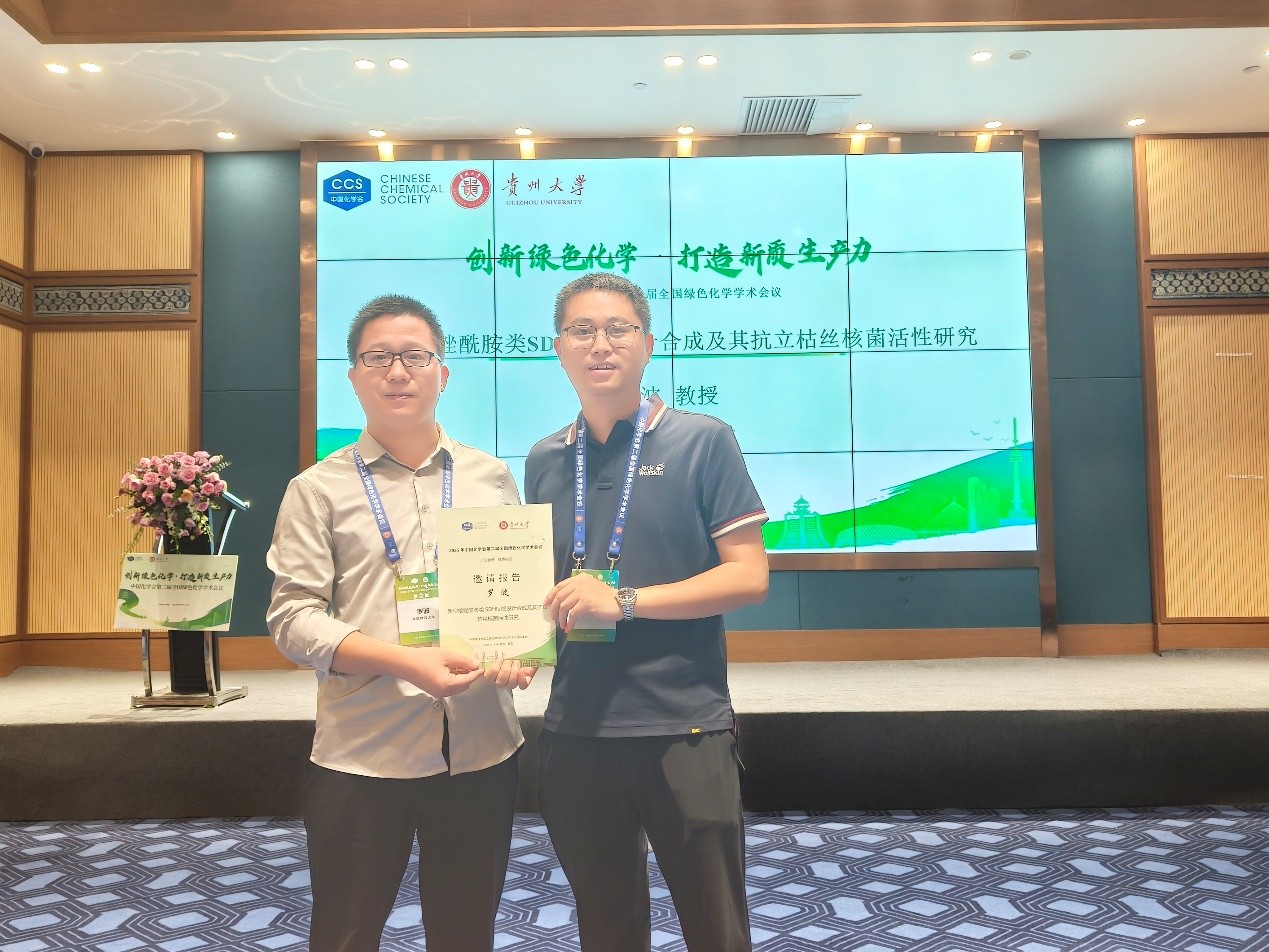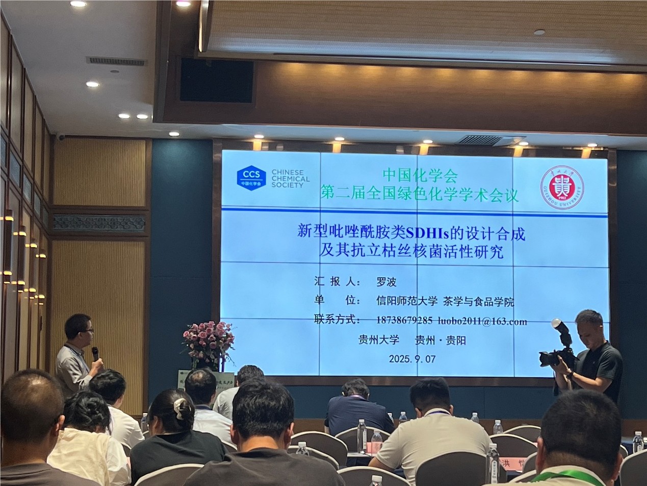 会议分为两个阶段:第一阶段为大会开幕式,第二阶段将举行六个专题分会,分别涵盖“高效绿色催化剂设计与催化反应”、“绿色反应路线与绿色产品”、“绿色化工科学与技术”、“绿色农药”、“绿色高分子材料化学”以及“育人育才研究生论坛”等议题。每个分会都将邀请相关领域的专家学者进行深入报告与交流。探花视频 罗波博士应邀作了题为“新型吡唑酰胺类的设计合成及其抗立枯丝核菌活性研究”的学术报告,介绍了团队近3年来在新型绿色环保琥珀酸脱氢酶抑制剂的创制与应用方面所取得的系列成果。