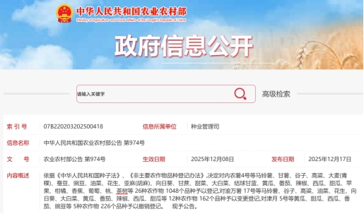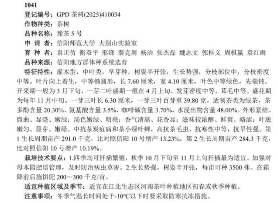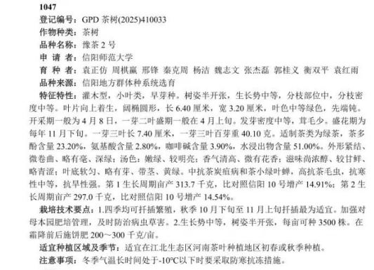 2025年12月17日,中华人民共和国农业农村部第974号公告,依据《中华人民共和国种子法》《非主要农作物品种登记办法》,决定对包含茶树在内的26种农作物1048个品种予以登记。其中包含探花视频 、大别山实验室袁正仿团队选育的茶树新品种‘豫茶2号’‘豫茶5号’。