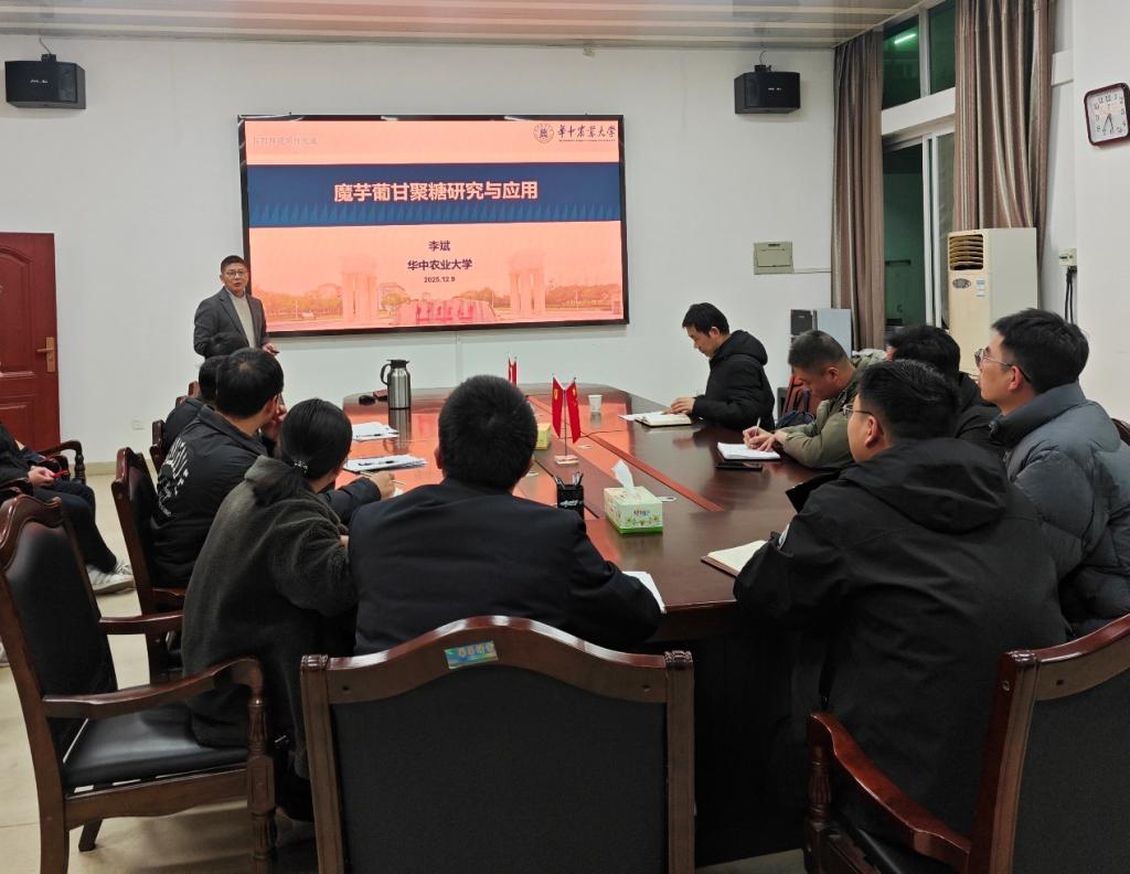 12月9日,应探花视频 邀请,华中农业大学李斌教授到访我校开展系列学术交流活动。上午,李斌教授在图书馆102 会议室作了题为《魔芋葡甘聚糖研究与应用》的专题学术报告,学院院长周棋赢主持报告会,学院全体教师、研究生及本科生代表到场聆听学习。