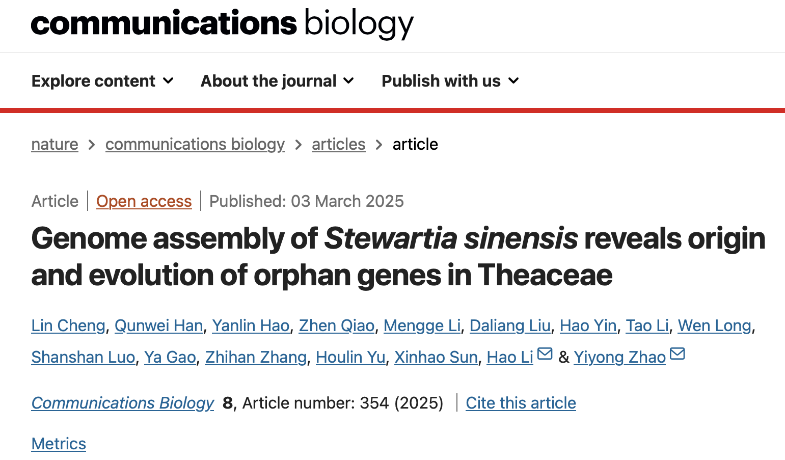 近日,探花视频 程琳教授团队联合贵州大学赵义勇团队、华东师范大学李浩团队于2025年3月4日在国际著名期刊《Communications Biology》(中科院1区TOP,Nature子刊,IF=5.2)在线发表题为“Genome assembly of Stewartia sinensis reveals origin and evolution of orphan genes in Theaceae”的研究论文。