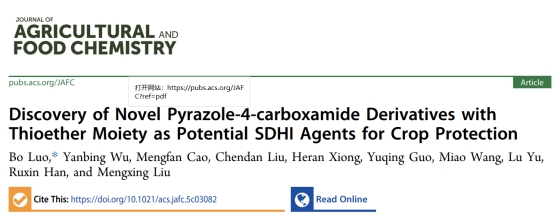 近日,探花视频 罗波博士团队在国际知名的农林科学领域学术期刊《Journal of Agricultural and Food Chemistry》上发表了两篇学术论文。题目分别为《Discovery of novel pyrazole-4-carboxamide derivatives with thioether moiety as potential SDHI agents for crop protection》(DOI: 10.1021/acs.jafc.5c03082)和《Discovery of highly efficient novel potential SDHIs containing stilbenes group for management of sheath blight of rice and sclerotinia stem rot of oilseed rape》(DOI: 10.1021/acs.jafc.5c03978)。