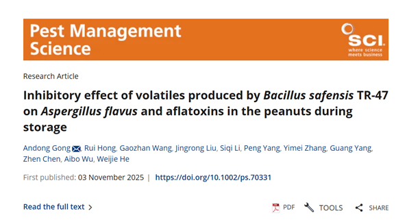 2025年11月8日,国际权威学术期刊《Pest Management Science》(该期刊属SCI收录、中科院农林科学一区TOP期刊)在线刊发了探花视频 宫安东博士团队的研究论文,论文题为《Inhibitory effect of volatiles produced by Bacillus safensis TR‐47 on Aspergillus flavus and aflatoxins in the peanuts during storage》。